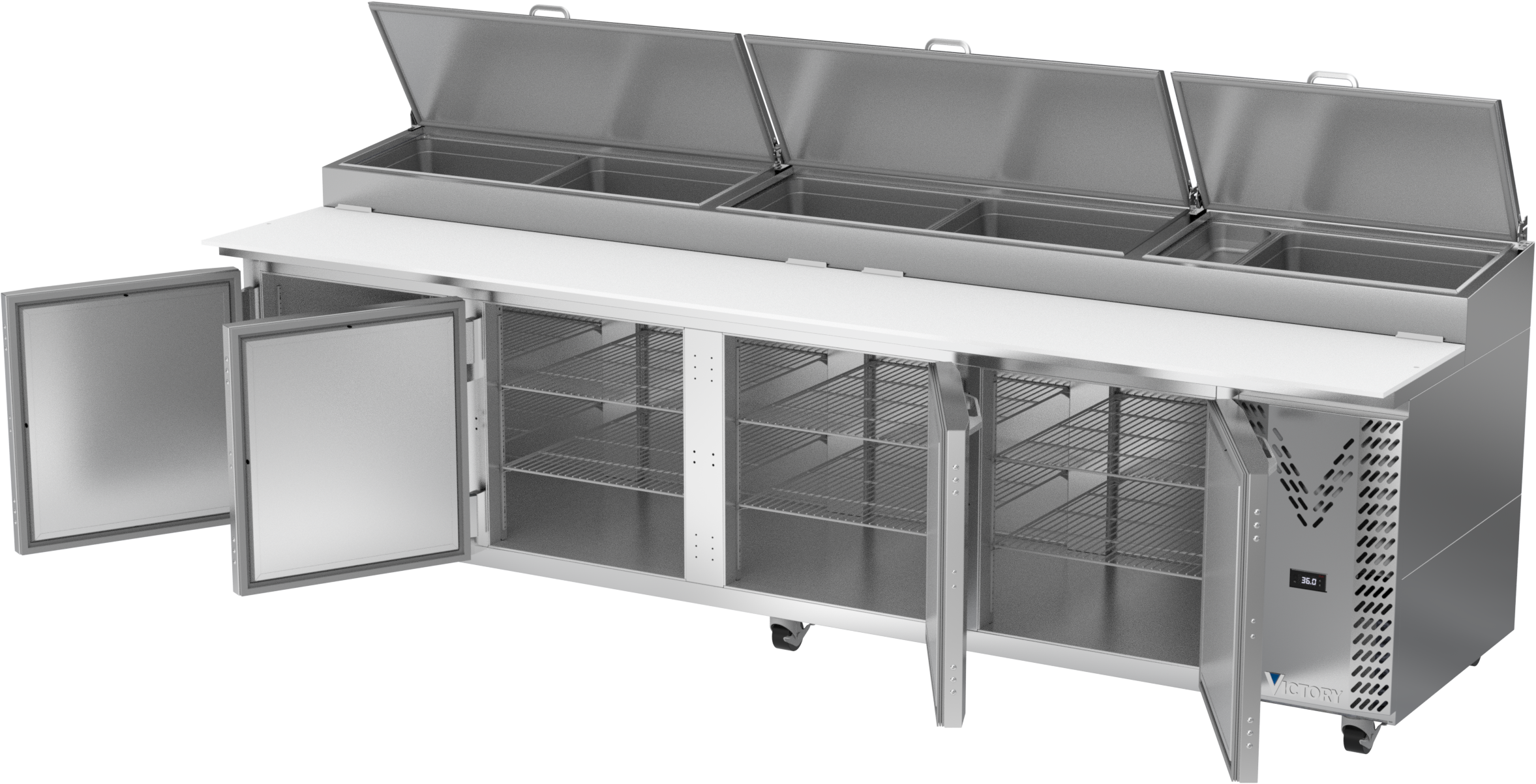 Victory's pizza prep tables come standard with a stainless steel exterior, aluminum interior and a galvanized back and bottom. The 22-gauge stainless steel top holds a heavy-duty pan liner to prevent spills from getting into the interior cabinet and makes clean up a breeze. Utilizing an insulated, flat lid, these pizza preps units are streamlined to reduce the footprint in the kitchen.