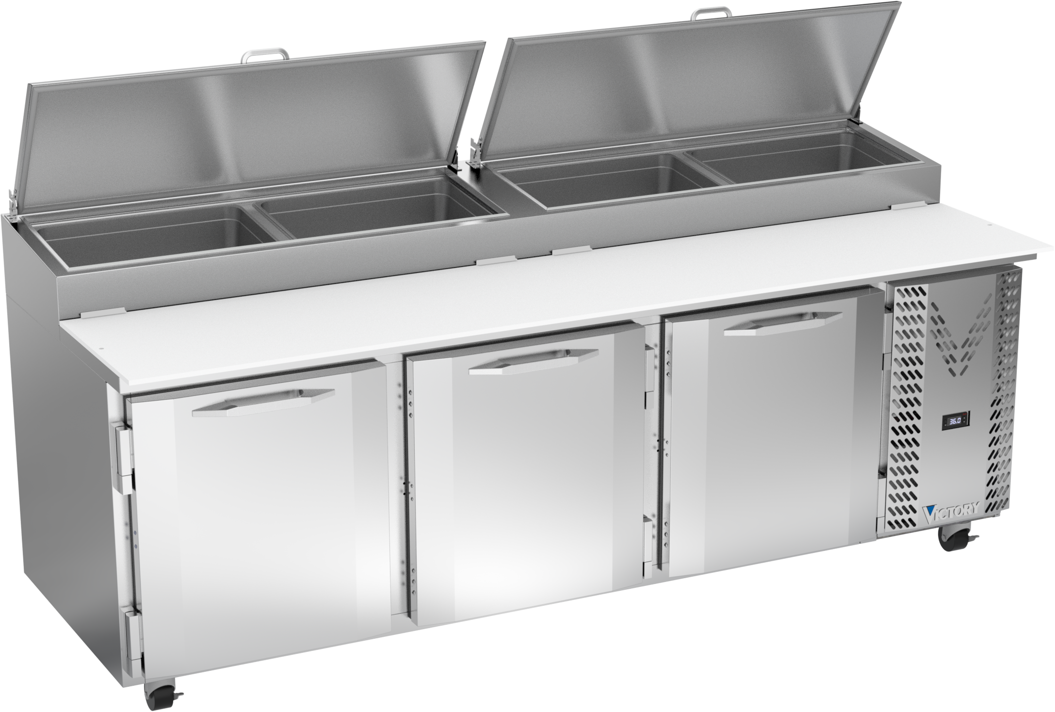 Victory's pizza prep tables come standard with a stainless steel exterior, aluminum interior and a galvanized back and bottom. The 22-gauge stainless steel top holds a heavy-duty pan liner to prevent spills from getting into the interior cabinet and makes clean up a breeze. Utilizing an insulated, flat lid, these pizza preps units are streamlined to reduce the footprint in the kitchen.