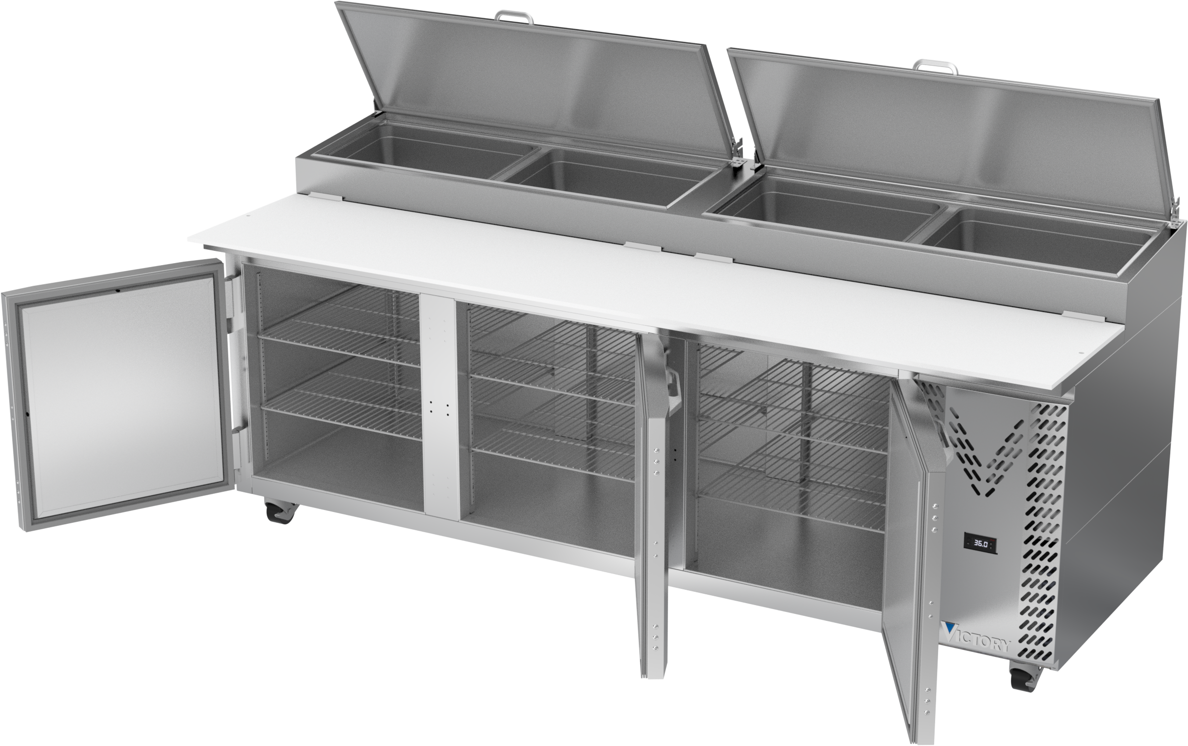 With an epoxy-coated coil to help extend the life of refrigeration system, each model comes standard with adaptive defrost, a feature that will reduce energy consumption by clearing the coil of ice buildup as needed. This allows for more consistent temperature stratification and quicker cabinet pull down. Victory pizza prep tables are capable of maintaining product temperatures of 36°F to 38°F.