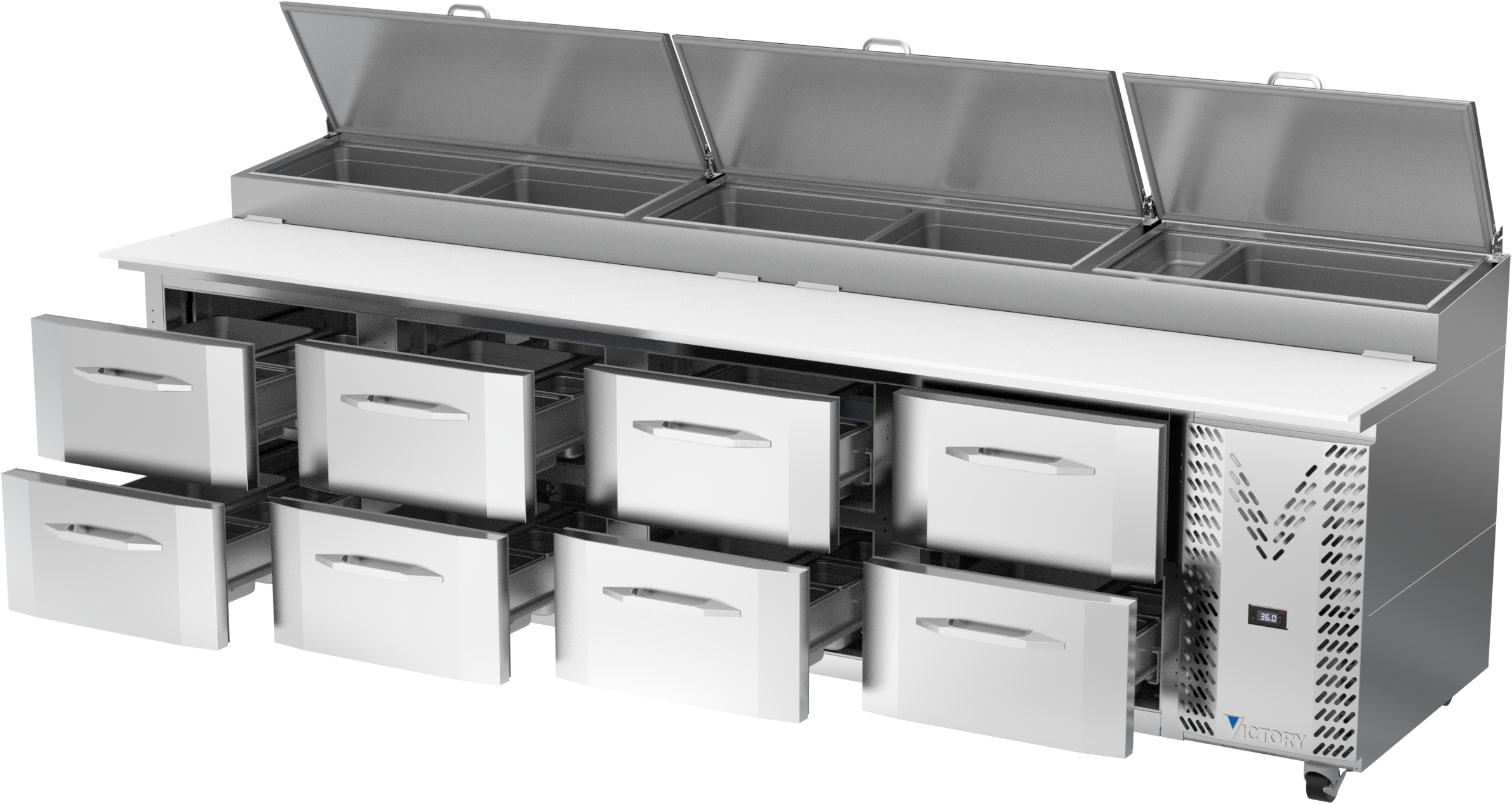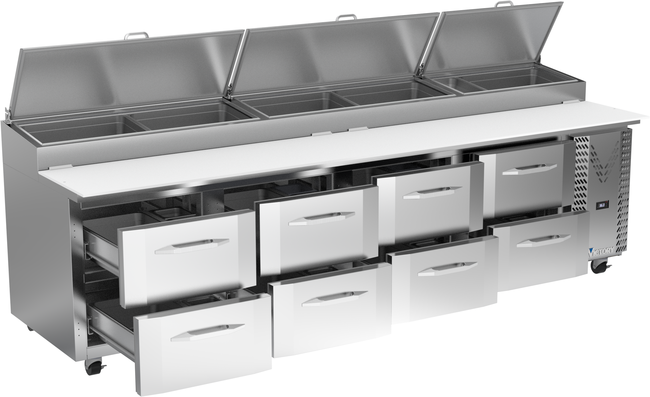 Drawer units feature a heavy-duty drawer slide system with an impressive 275 lbs drawer load rating (per drawer). Low-profile handles and beveled door and drawer faces offer a stylish look without compromising functionality. Featuring a full electronic control with a one-touch defrost and digital display, the Victory pizza prep tables offer ease of use with quick temperature adjustments.