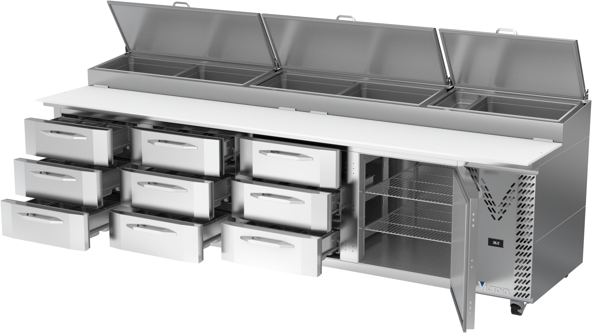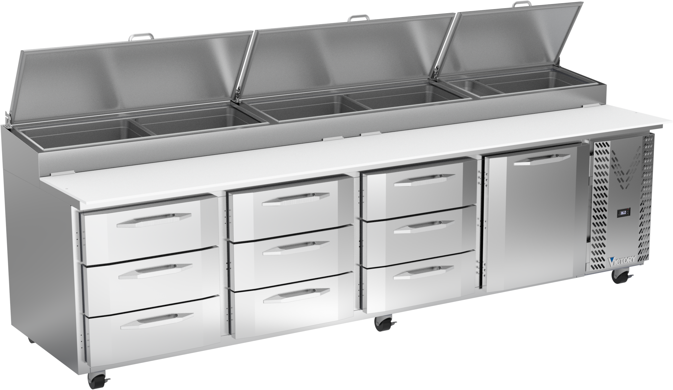Drawer units feature a heavy-duty drawer slide system with an impressive 275 lbs drawer load rating (per drawer). Low-profile handles and beveled door and drawer faces offer a stylish look without compromising functionality. Featuring a full electronic control with a one-touch defrost and digital display, the Victory pizza prep tables offer ease of use with quick temperature adjustments.