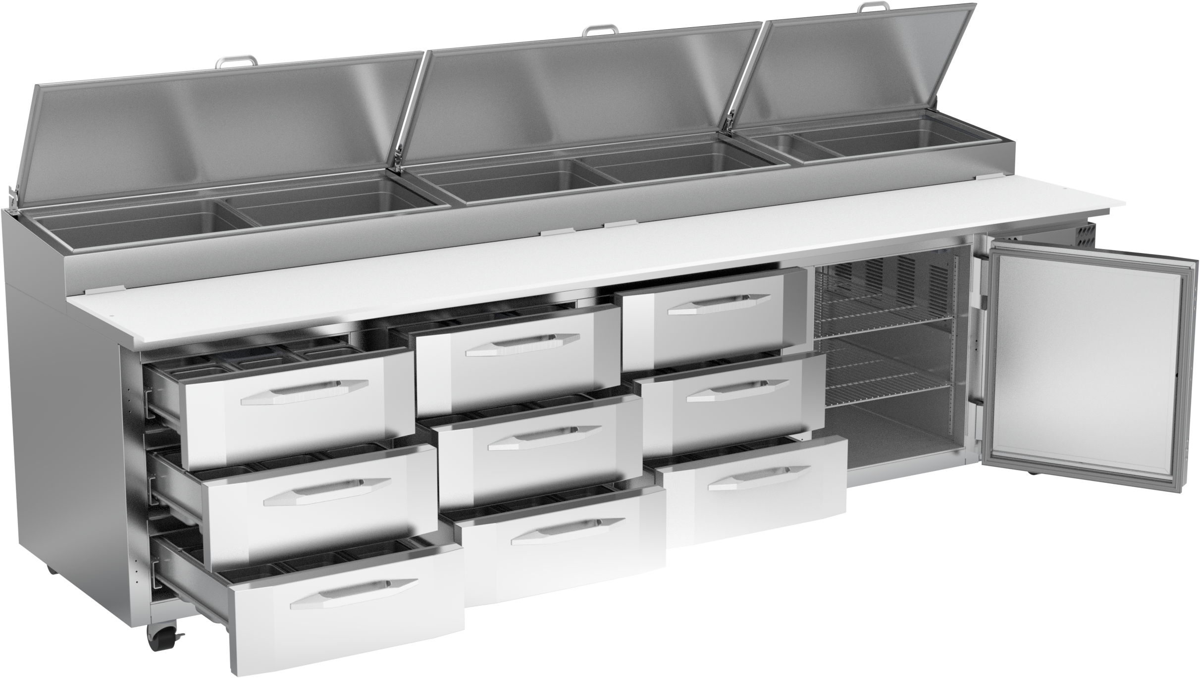 Available in door or drawer configurations, door models are set on cartridge style hinges, with a stay-open feature for easy product loading. Door and drawer configurations have a one-piece, snap-in gasket. Both pan opening and lower drawers (drawer units) accommodate 6-inch deep food service pans with locking divider bars and a removable 19-inch cutting board for quick and easy cleaning.