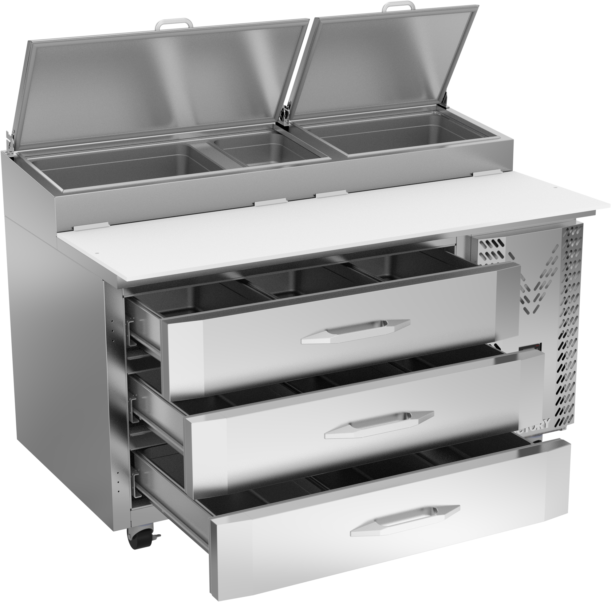 Available in door or drawer configurations, door models are set on cartridge style hinges, with a stay-open feature for easy product loading. Door and drawer configurations have a one-piece, snap-in gasket. Both pan opening and lower drawers (drawer units) accommodate 6-inch deep food service pans with locking divider bars and a removable 19-inch cutting board for quick and easy cleaning.