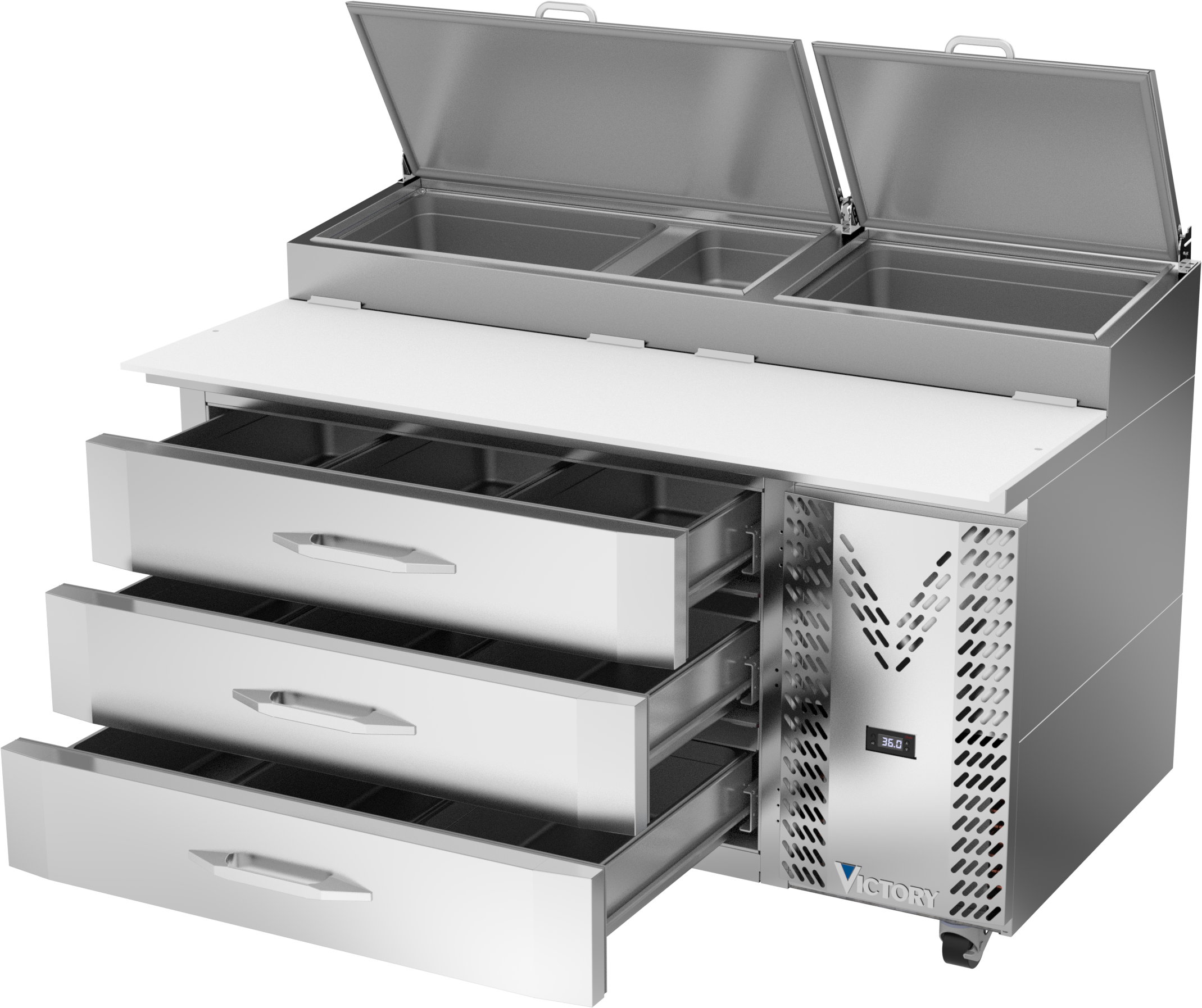 With an epoxy-coated coil to help extend the life of refrigeration system, each model comes standard with adaptive defrost, a feature that will reduce energy consumption by clearing the coil of ice buildup as needed. This allows for more consistent temperature stratification and quicker cabinet pull down. Victory pizza prep tables are capable of maintaining product temperatures of 36°F to 38°F.