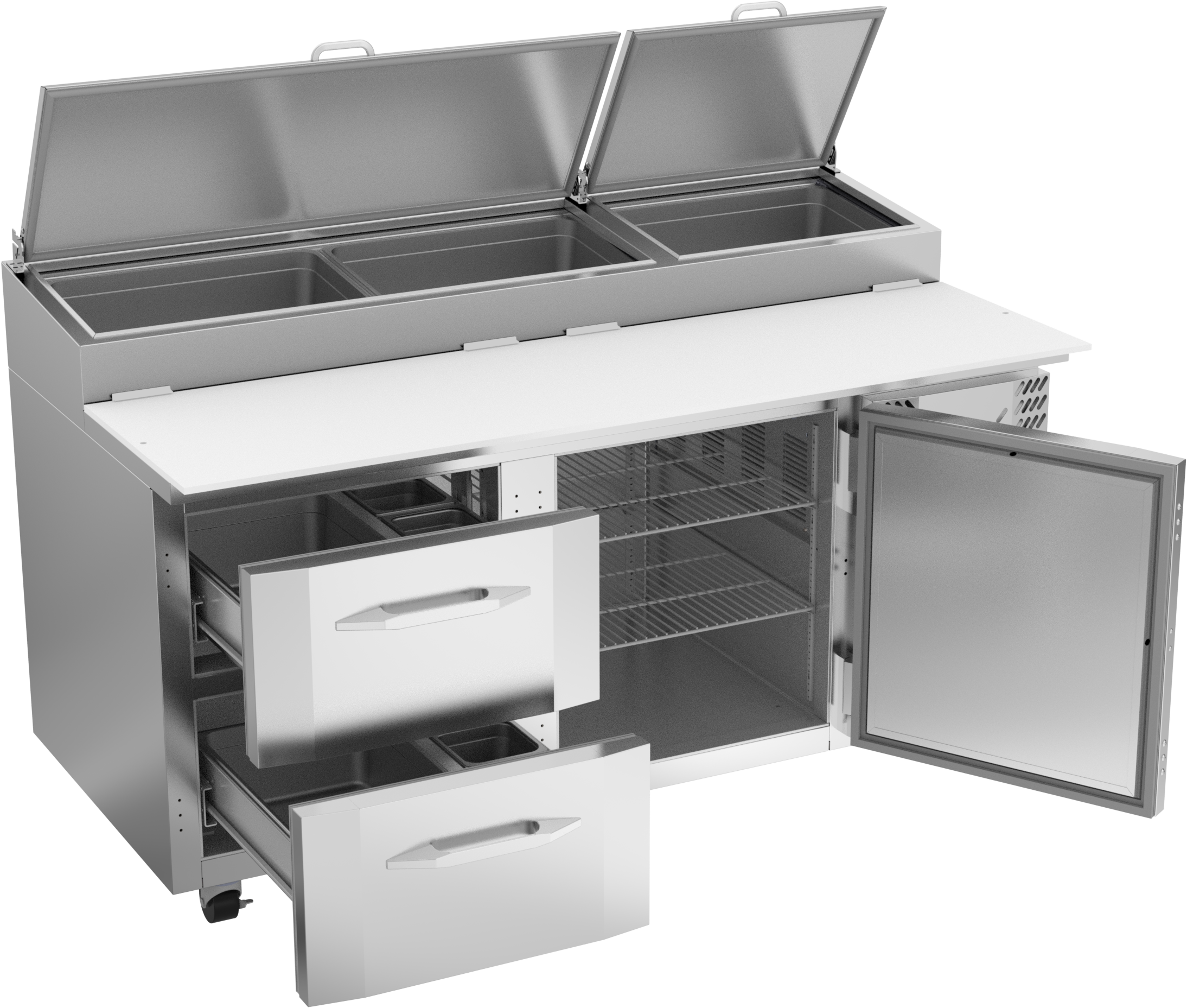 Available in door or drawer configurations, door models are set on cartridge style hinges, with a stay-open feature for easy product loading. Door and drawer configurations have a one-piece, snap-in gasket. Both pan opening and lower drawers (drawer units) accommodate 6-inch deep food service pans with locking divider bars and a removable 19-inch cutting board for quick and easy cleaning.