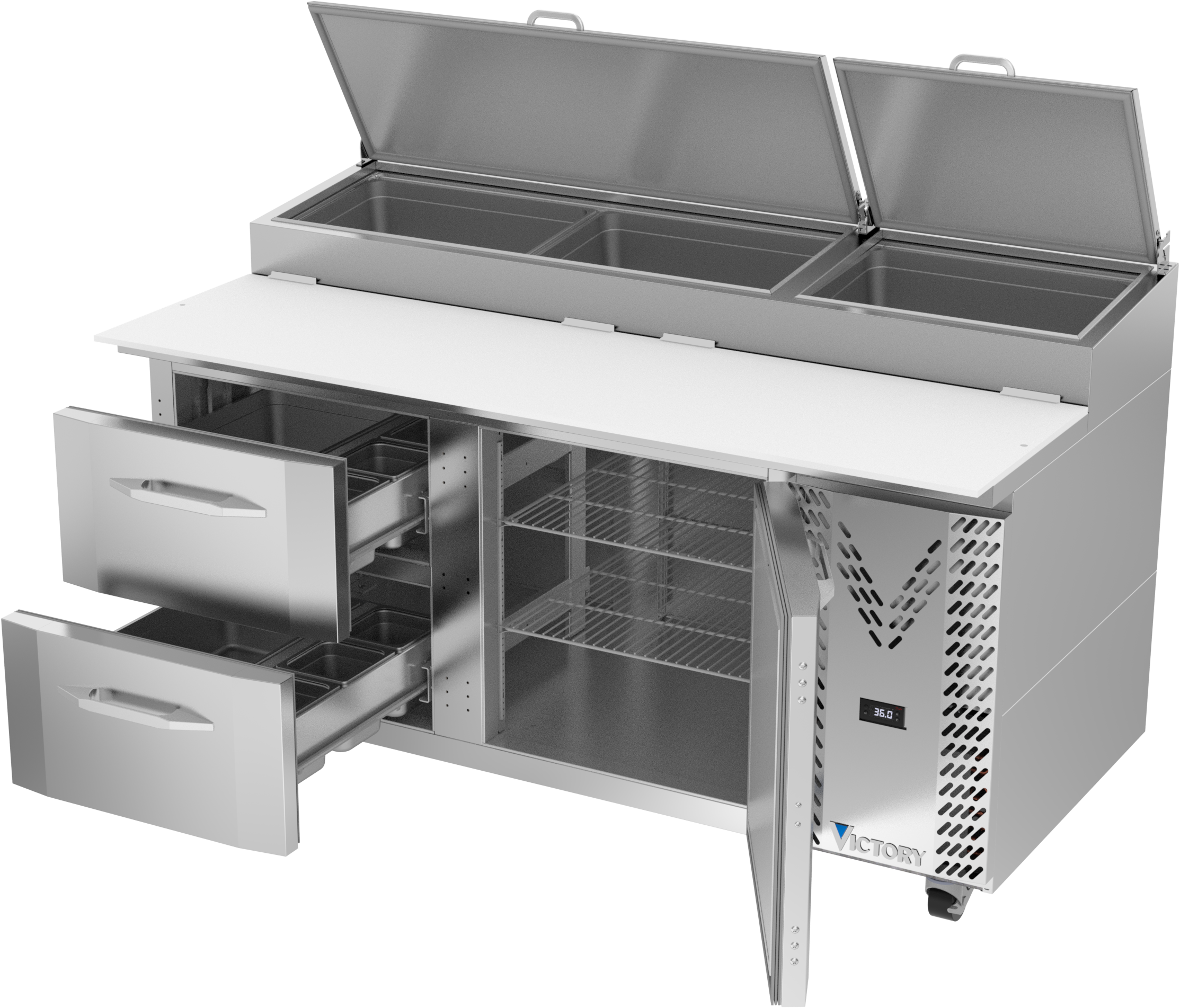 Victory's pizza prep tables come standard with a stainless steel exterior, aluminum interior and a galvanized back and bottom. The 22-gauge stainless steel top holds a heavy-duty pan liner to prevent spills from getting into the interior cabinet and makes clean up a breeze. Utilizing an insulated, flat lid, these pizza preps units are streamlined to reduce the footprint in the kitchen.