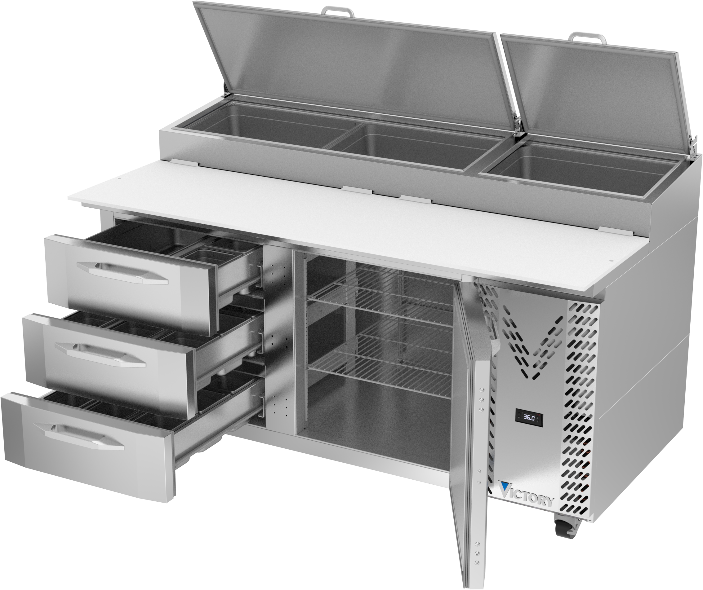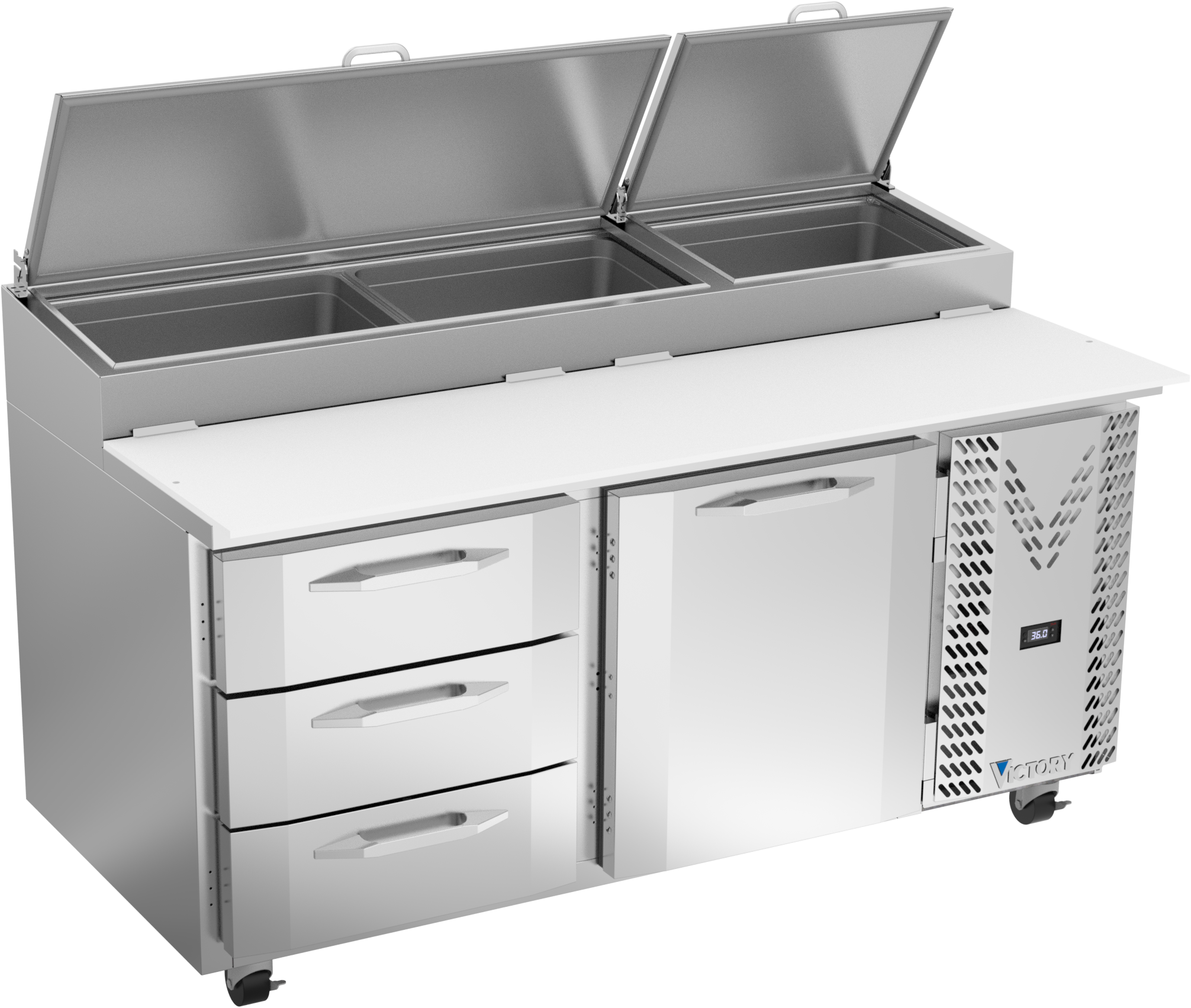 Drawer units feature a heavy-duty drawer slide system with an impressive 275 lbs drawer load rating (per drawer). Low-profile handles and beveled door and drawer faces offer a stylish look without compromising functionality. Featuring a full electronic control with a one-touch defrost and digital display, the Victory pizza prep tables offer ease of use with quick temperature adjustments.