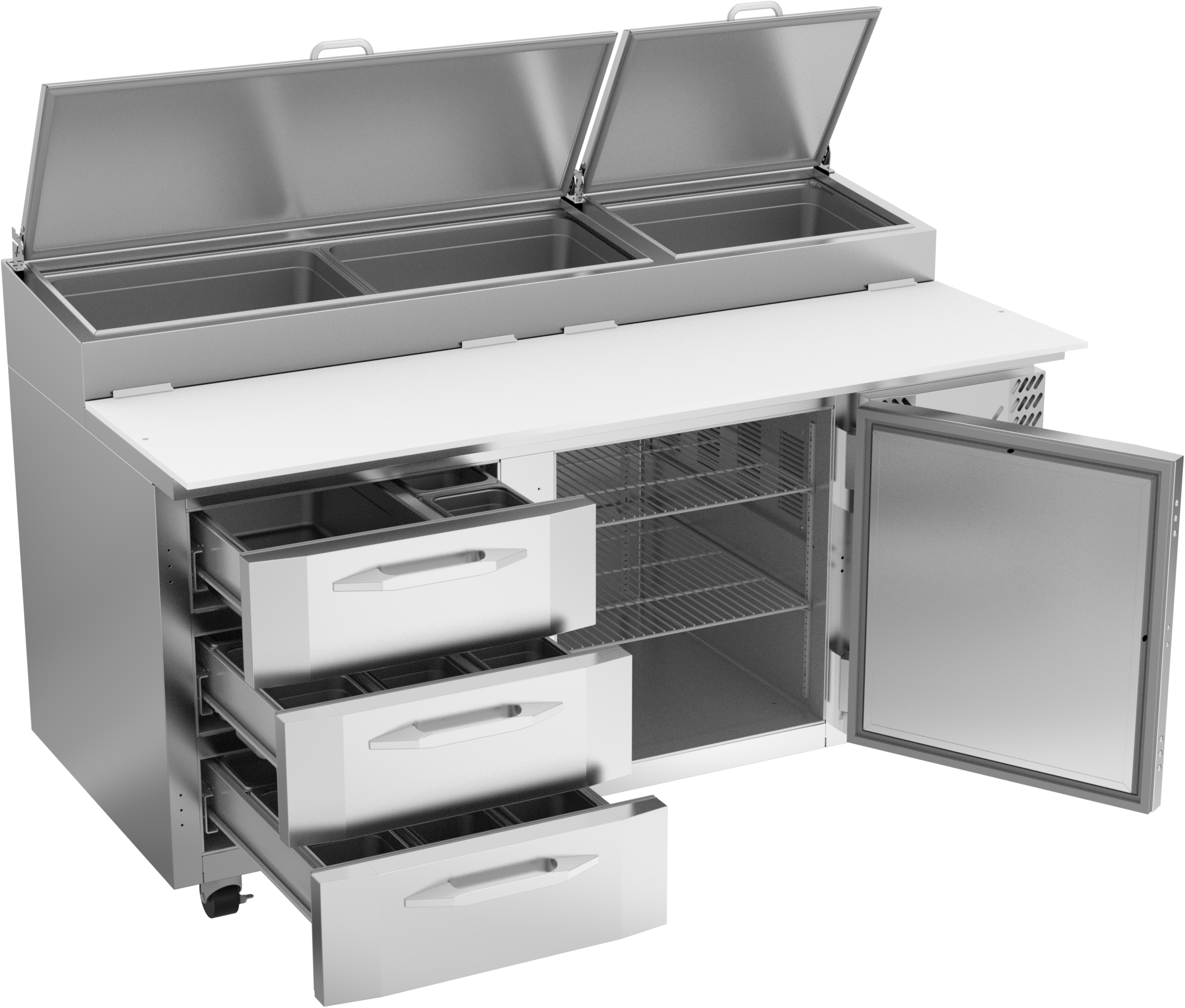 Available in door or drawer configurations, door models are set on cartridge style hinges, with a stay-open feature for easy product loading. Door and drawer configurations have a one-piece, snap-in gasket. Both pan opening and lower drawers (drawer units) accommodate 6-inch deep food service pans with locking divider bars and a removable 19-inch cutting board for quick and easy cleaning.