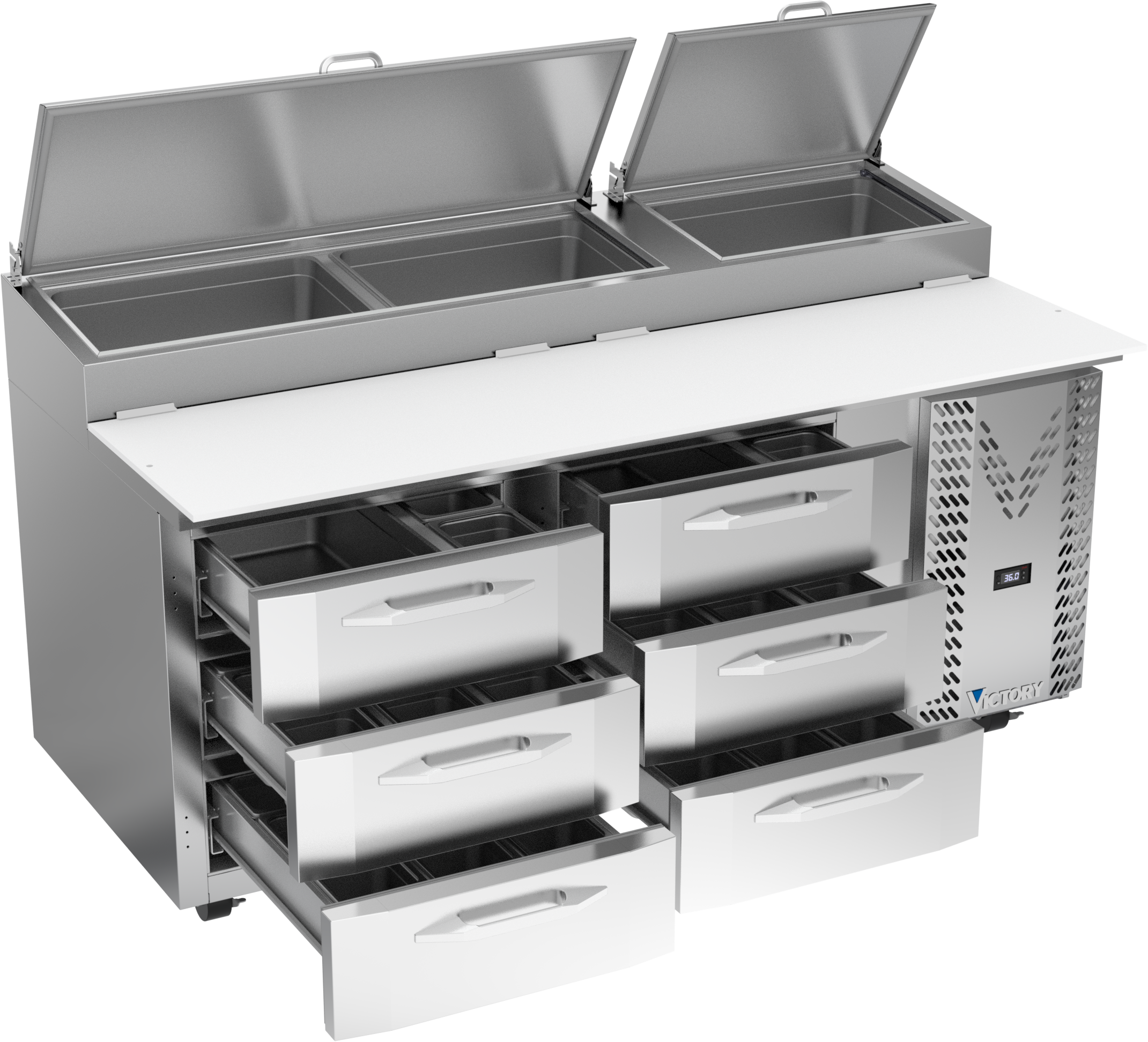 Victory's pizza prep tables come standard with a stainless steel exterior, aluminum interior and a galvanized back and bottom. The 22-gauge stainless steel top holds a heavy-duty pan liner to prevent spills from getting into the interior cabinet and makes clean up a breeze. Utilizing an insulated, flat lid, these pizza preps units are streamlined to reduce the footprint in the kitchen.