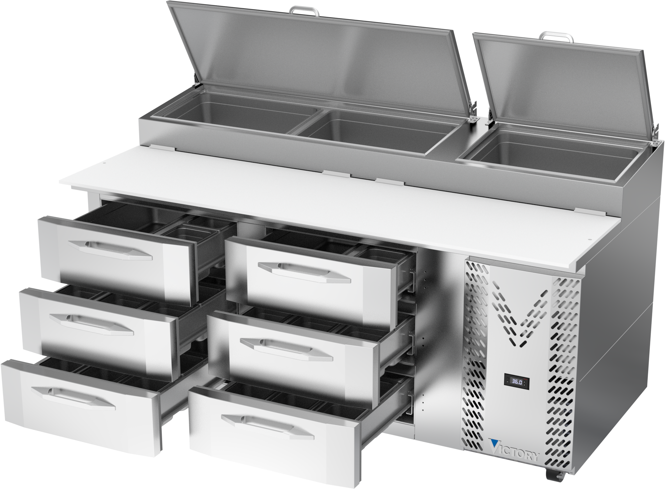 Drawer units feature a heavy-duty drawer slide system with an impressive 275 lbs drawer load rating (per drawer). Low-profile handles and beveled door and drawer faces offer a stylish look without compromising functionality. Featuring a full electronic control with a one-touch defrost and digital display, the Victory pizza prep tables offer ease of use with quick temperature adjustments.