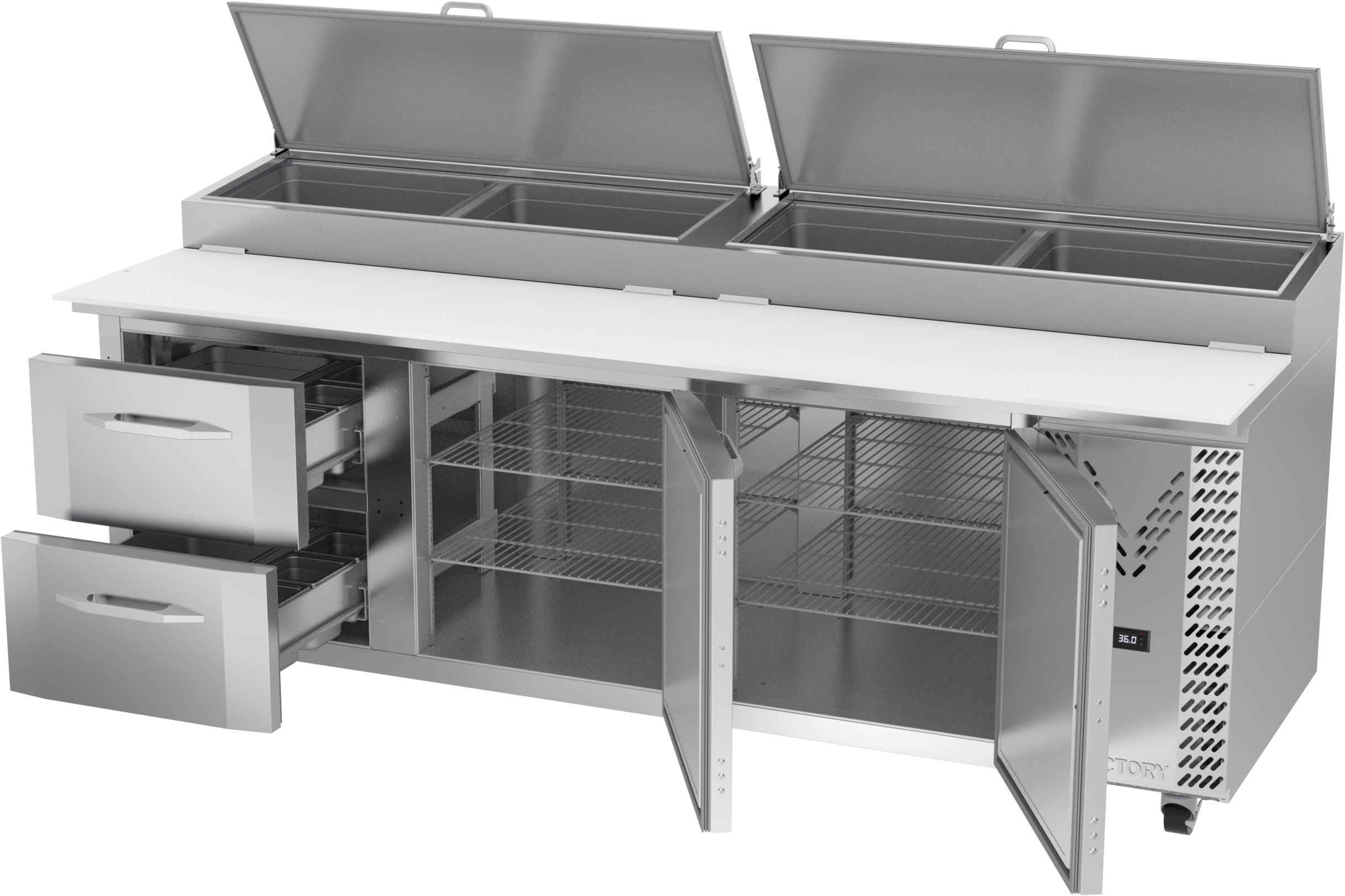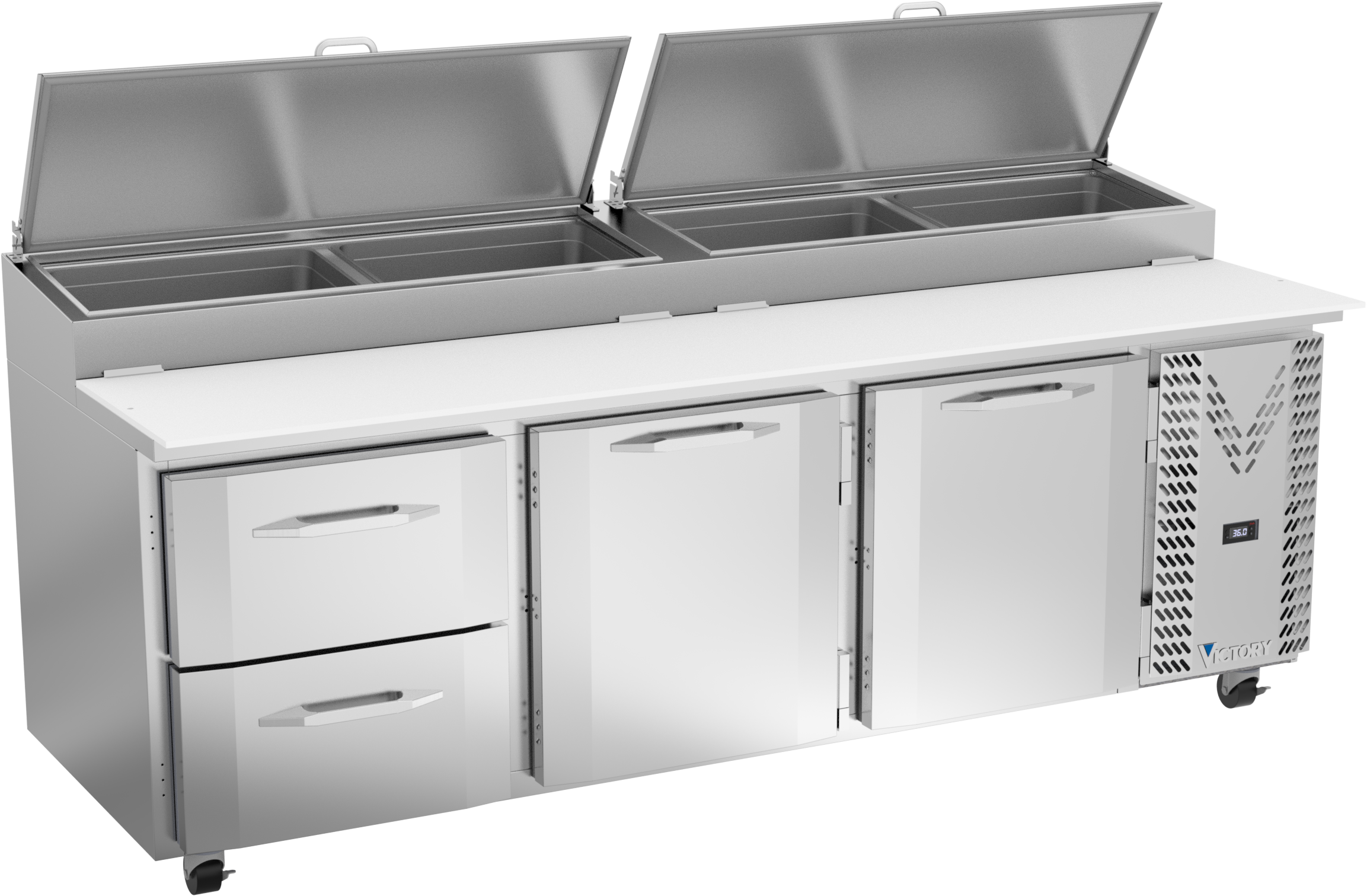 Drawer units feature a heavy-duty drawer slide system with an impressive 275 lbs drawer load rating (per drawer). Low-profile handles and beveled door and drawer faces offer a stylish look without compromising functionality. Featuring a full electronic control with a one-touch defrost and digital display, the Victory pizza prep tables offer ease of use with quick temperature adjustments.