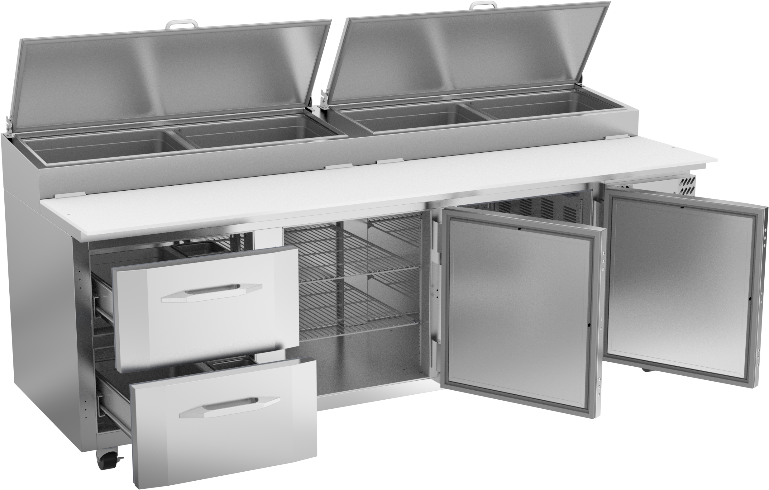 Available in door or drawer configurations, door models are set on cartridge style hinges, with a stay-open feature for easy product loading. Door and drawer configurations have a one-piece, snap-in gasket. Both pan opening and lower drawers (drawer units) accommodate 6-inch deep food service pans with locking divider bars and a removable 19-inch cutting board for quick and easy cleaning.
