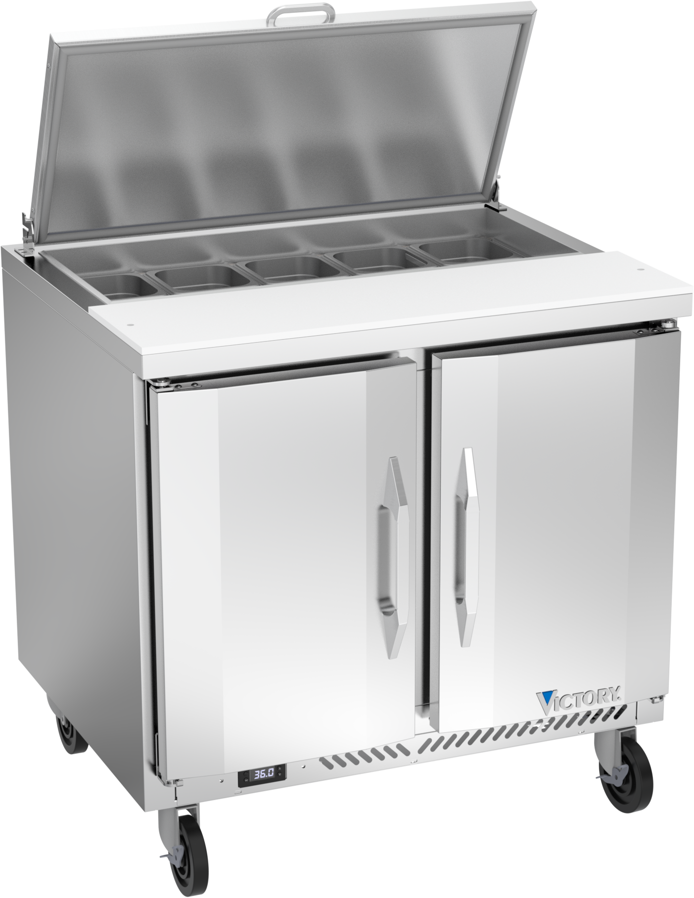 Low-profile handles and beveled door and drawer faces offer a stylish look without compromising functionality. Featuring a full electronic control with a one-touch defrost and digital display, the Victory sandwich prep tables offer ease of use with quick temperature adjustments.