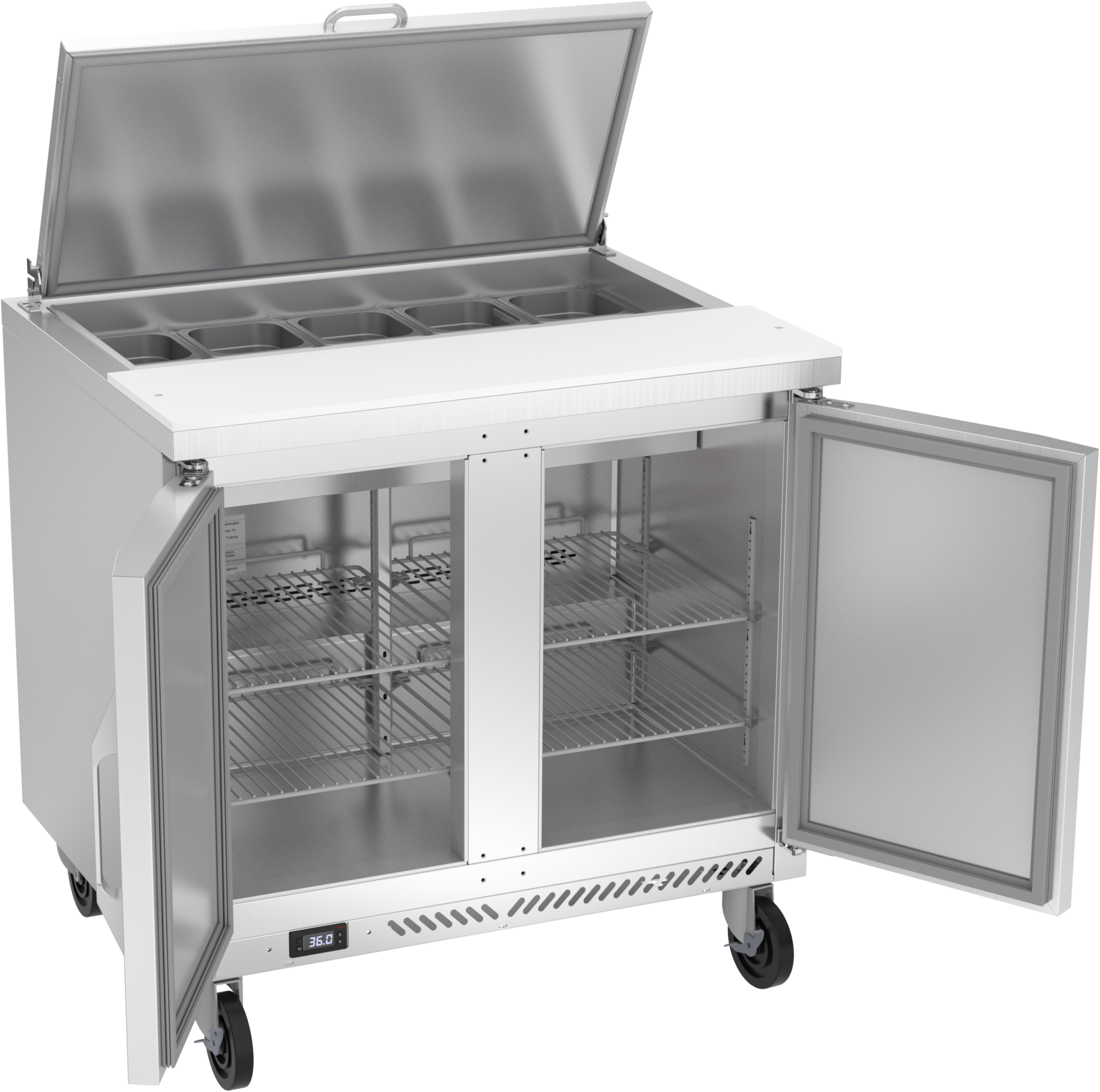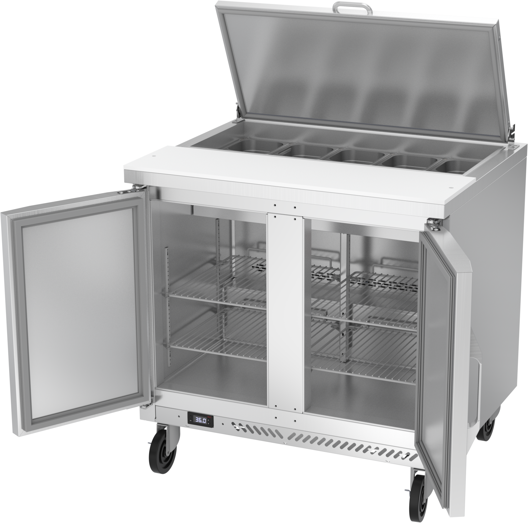 Available in door or drawer configurations, door models are set on cartridge style hinges, with a stay-open feature for easy product loading. Both pan opening and lower drawers (drawer units) accommodate 6-inch deep food service pans with locking divider bars and a removable 10-inch cutting board for quick and easy cleaning. Door and drawer configurations have a one-piece, snap in gasket.