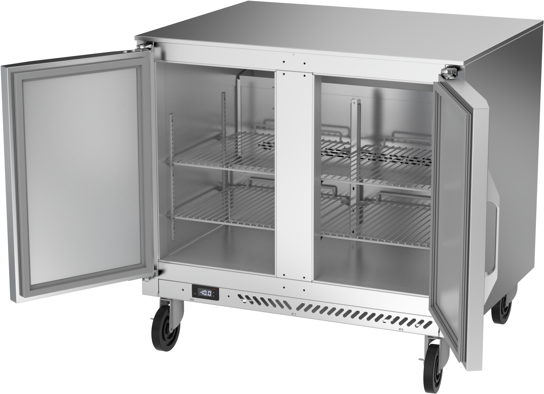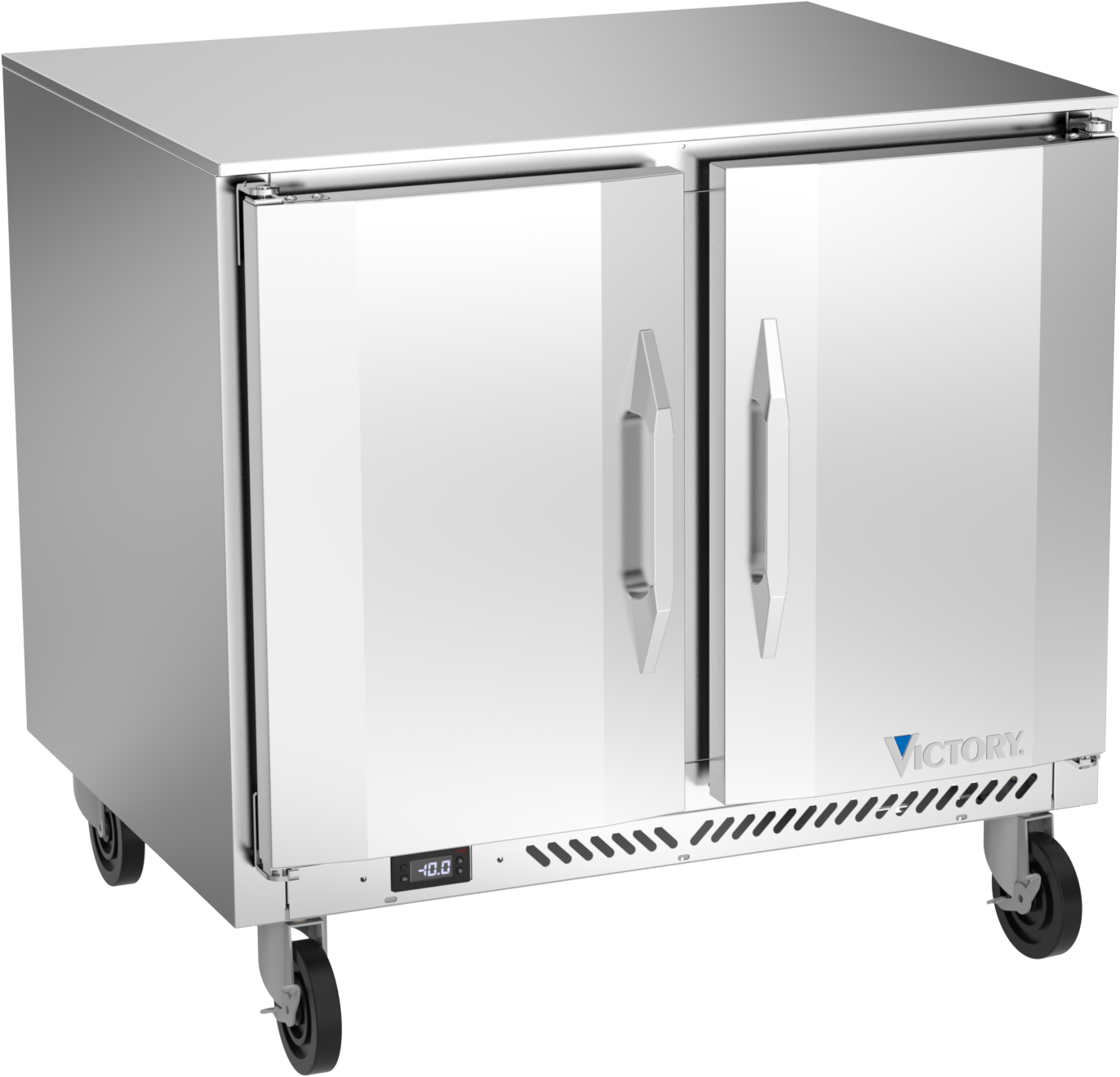Victory undercounter units come standard with a stainless steel exterior, aluminum interior and a galvanized back and bottom. The 1/2-inch sub-top ensures these undercounters easily fit under standard counters. Available in ADA heights with door or drawer configurations. Door models are set on cartridge style hinges, with a stay-open feature for easy product loading. Both door and drawer configurations have a one-piece, snap-in gasket. Drawer units, both upper and lower, accommodate 6-inch deep food service pans. The low-profile handles and beveled door and drawer faces offer a stylish look without compromising functionality. Featuring a full electronic control with a one-touch defrost and digital display, the Victory undercounter models offer ease of use with quick temperature adjustments.