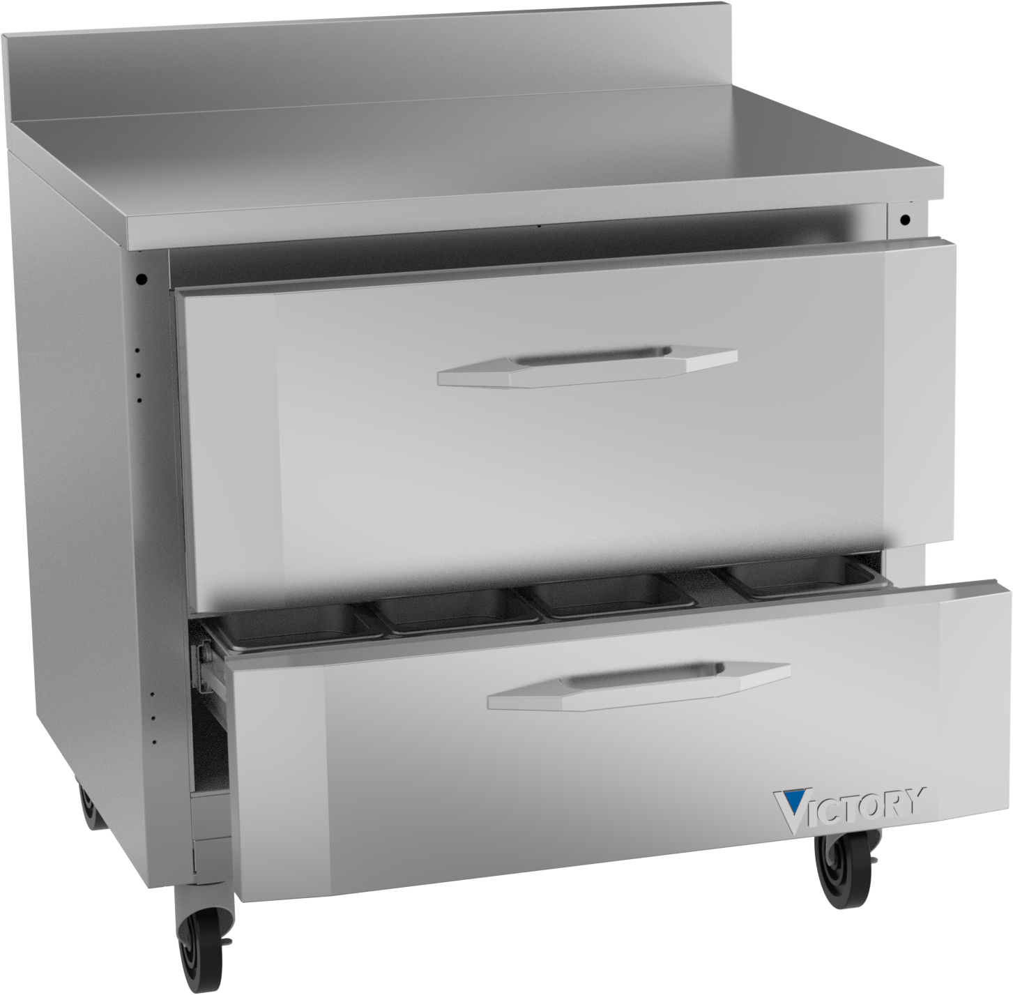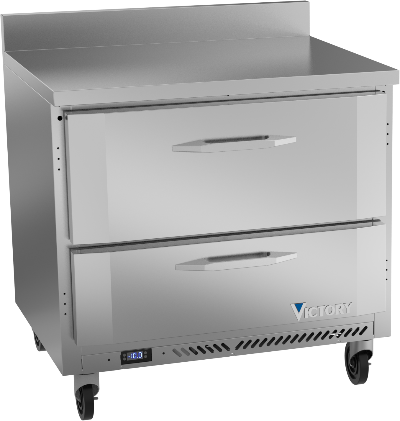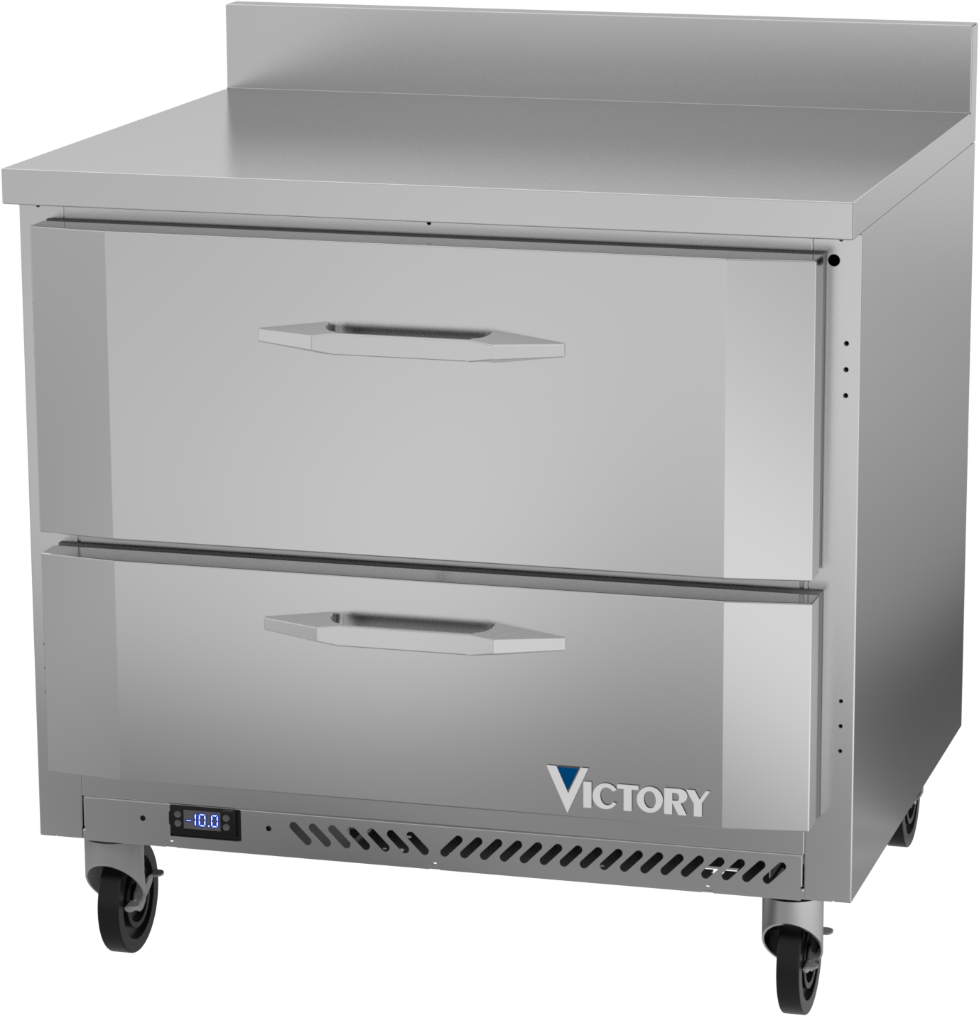 With a 4-inch foamed-in-place stainless steel backsplash, Victory worktop units come standard with a stainless steel exterior, aluminum interior and a galvanized back and bottom. Available in door or drawer configurations, door models are set on cartridge style hinges, with a stay-open feature for easy product loading. Both door and drawer configurations have a one-piece, snap in gasket. Drawer units, both upper and lower, accommodate 6-inch deep food service pans. The low-profile handles and beveled door and drawer faces offer a stylish look without compromising functionality. Featuring a full electronic control with a one-touch defrost and digital display, the Victory worktop models offer ease of use with quick temperature adjustments.