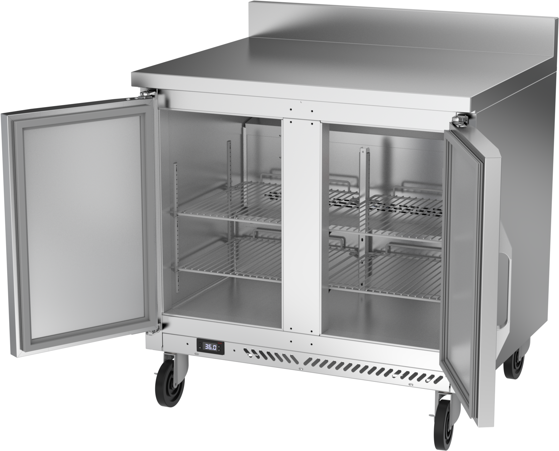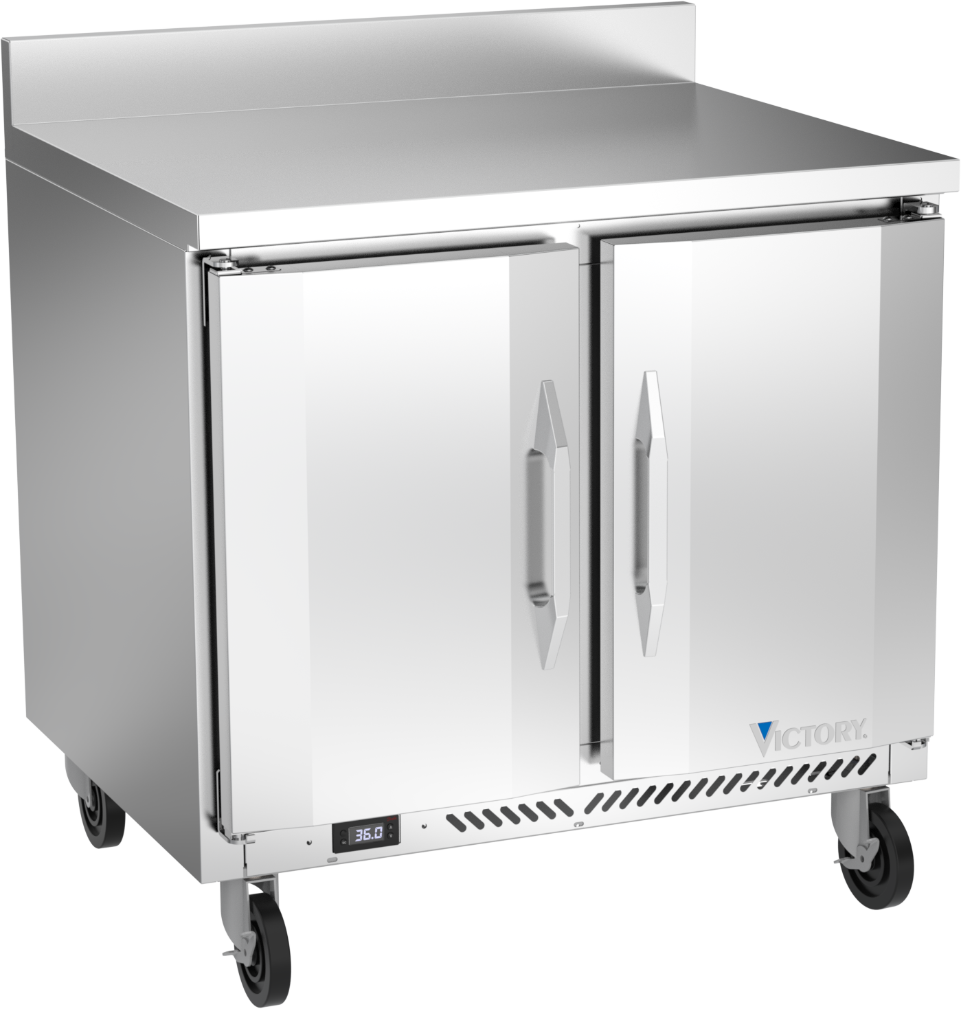 With a 4-inch foamed-in-place stainless steel backsplash, Victory worktop units come standard with a stainless steel exterior, aluminum interior and a galvanized back and bottom. Available in door or drawer configurations, door models are set on cartridge style hinges, with a stay-open feature for easy product loading. Both door and drawer configurations have a one-piece, snap in gasket. Drawer units, both upper and lower, accommodate 6-inch deep food service pans. The low-profile handles and beveled door and drawer faces offer a stylish look without compromising functionality. Featuring a full electronic control with a one-touch defrost and digital display, the Victory worktop models offer ease of use with quick temperature adjustments.